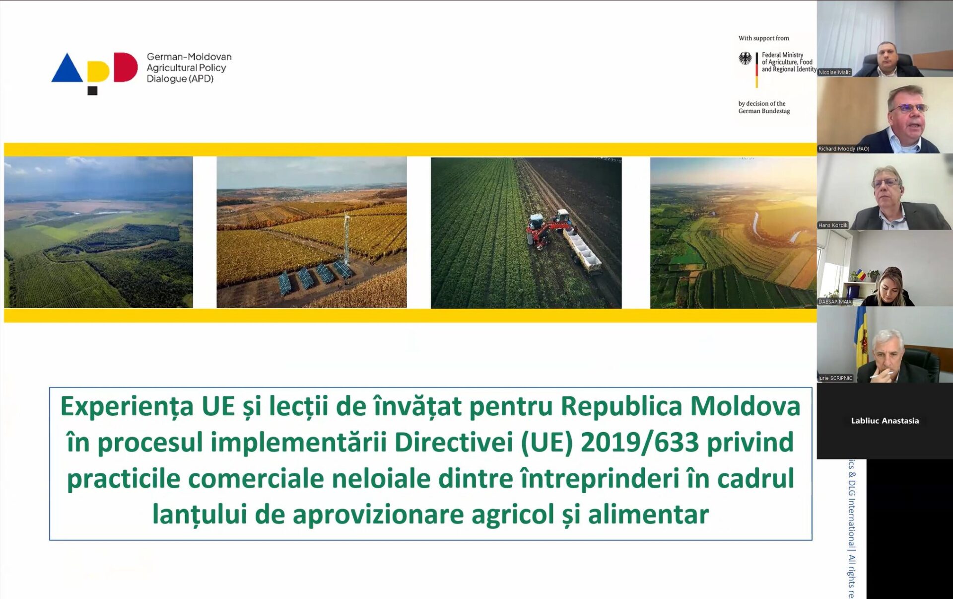 Discussions emphasized that the Directive is of paramount importance for fostering fair trading practices, enhancing market transparency, and supporting a sustainable and resilient agricultural sector. The Mentoring Group benefited from the participation of State Secretary Iurie Scripnic from the Ministry of Agriculture and Food Industry (MAIA), as well as representatives from the Chamber of Commerce and Industry, reflecting on the relevance of these measures for Moldova and exploring ways to adapt EU best practices to national conditions.